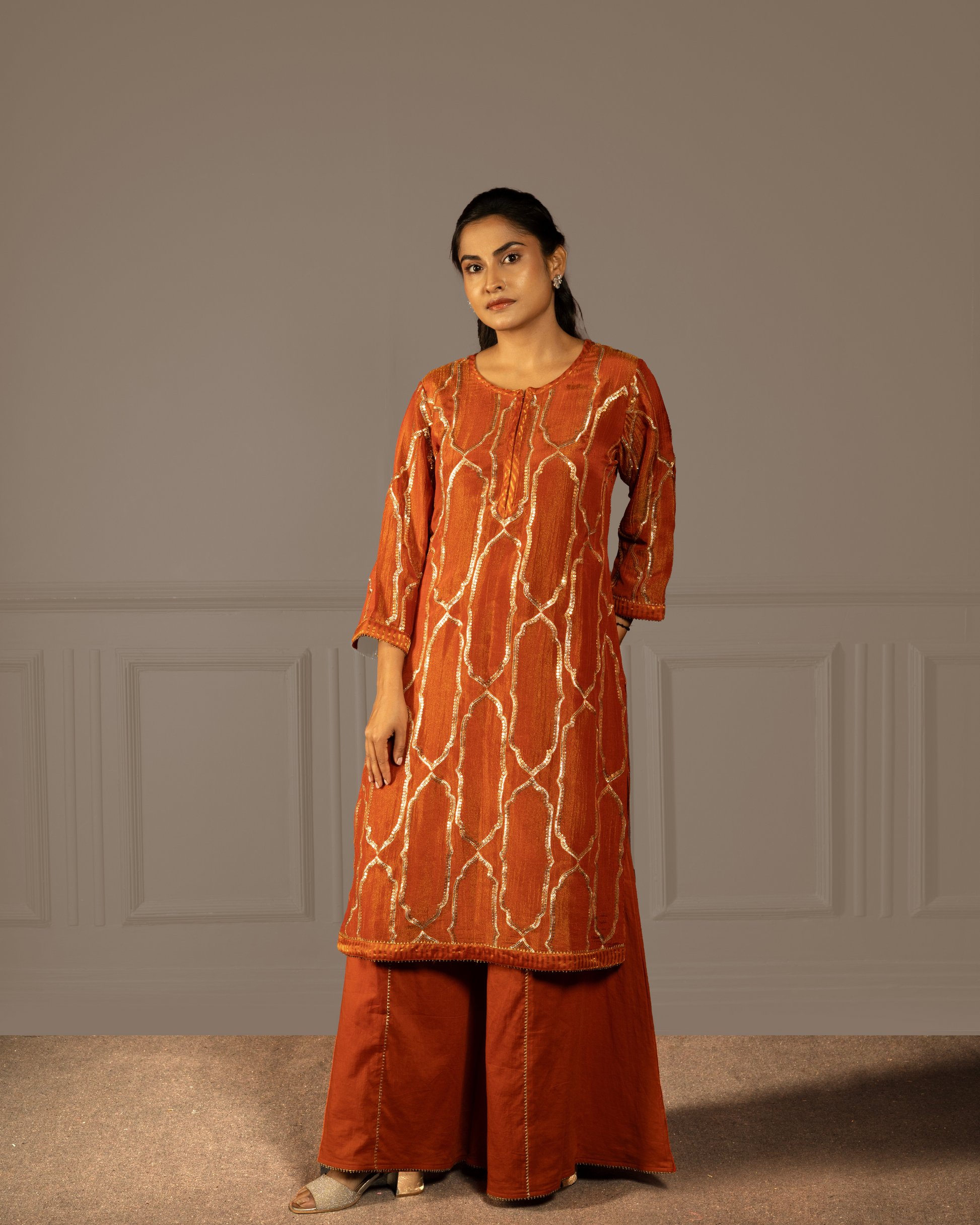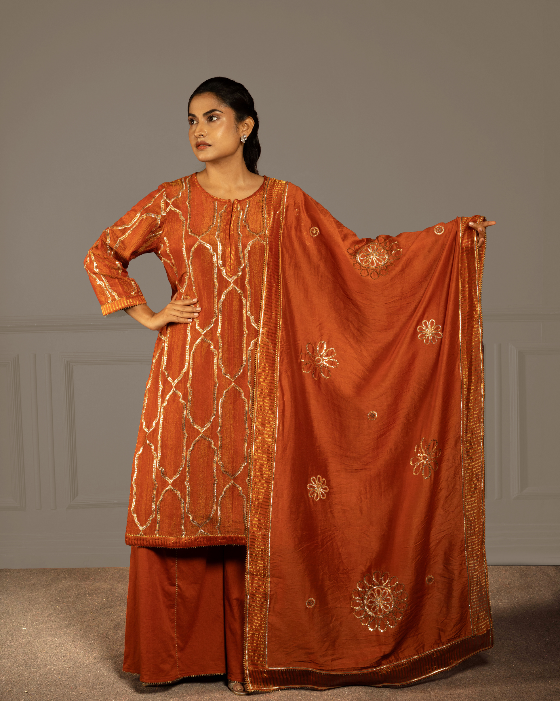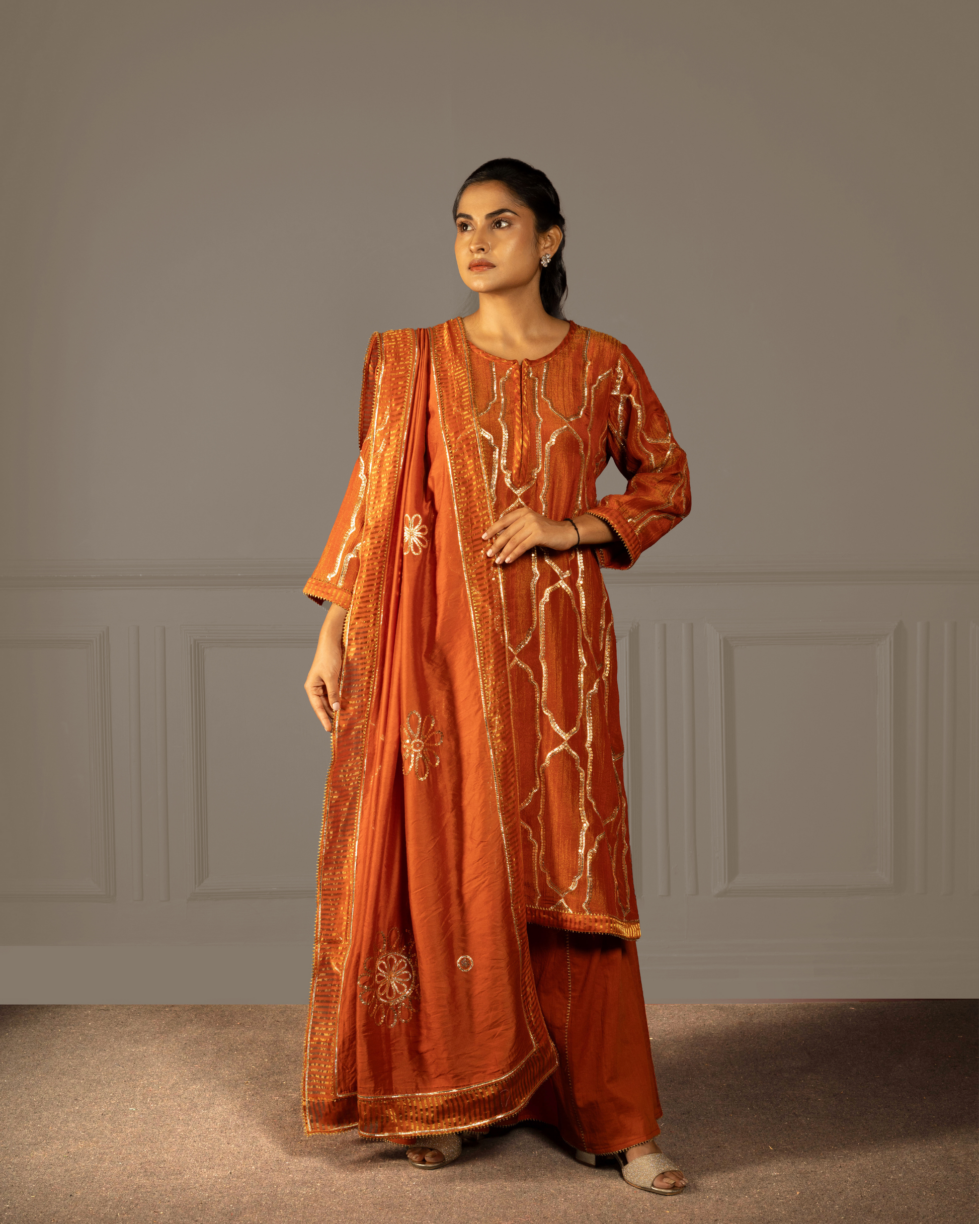 A rust-red kurta set in luminous tissue crush with kali pant and dupatta, richly adorned with gota, tikki, and hand–machine embroidery — carrying the fierce, sacred flame of fire in every fold.