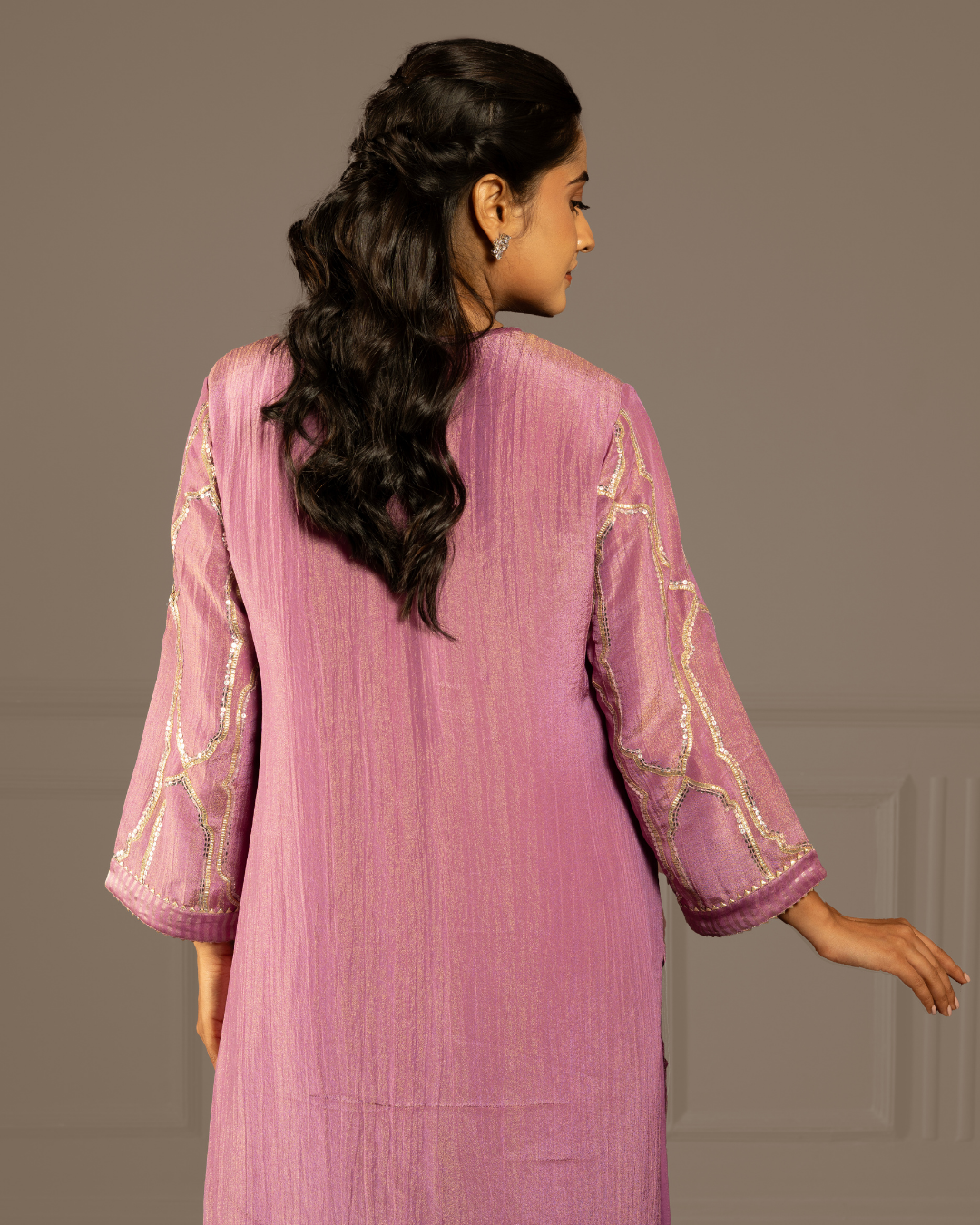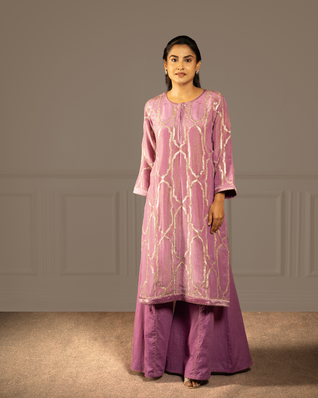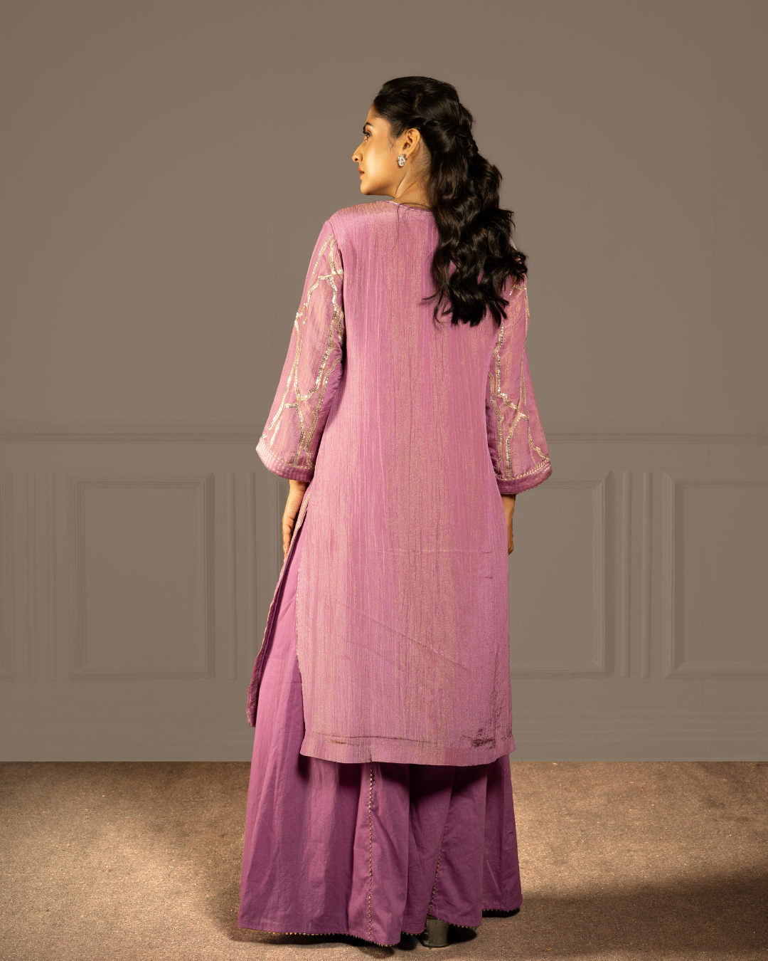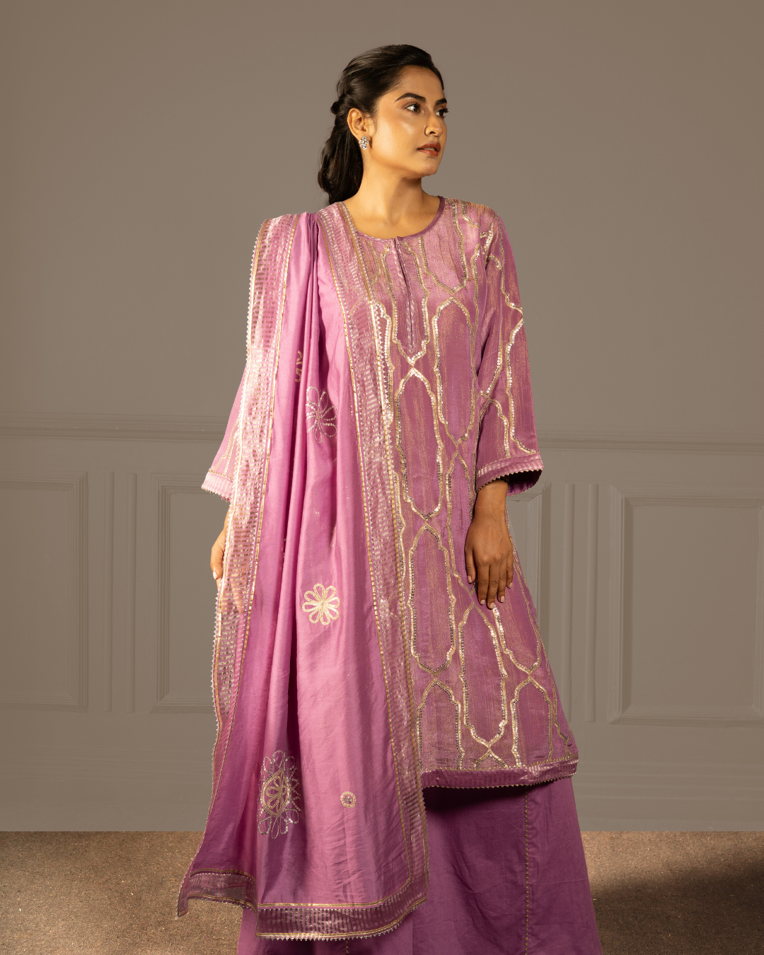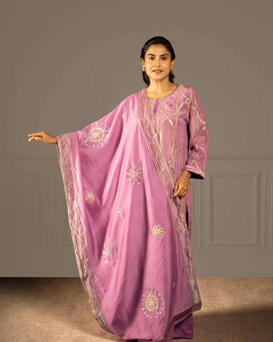 A purple kurta set with kali pants and dupatta in soft tissue crush, shimmering with gota, tikki and intricate hand- machine embroidery - holding the spacious, infinite stillness of the sky in thread.