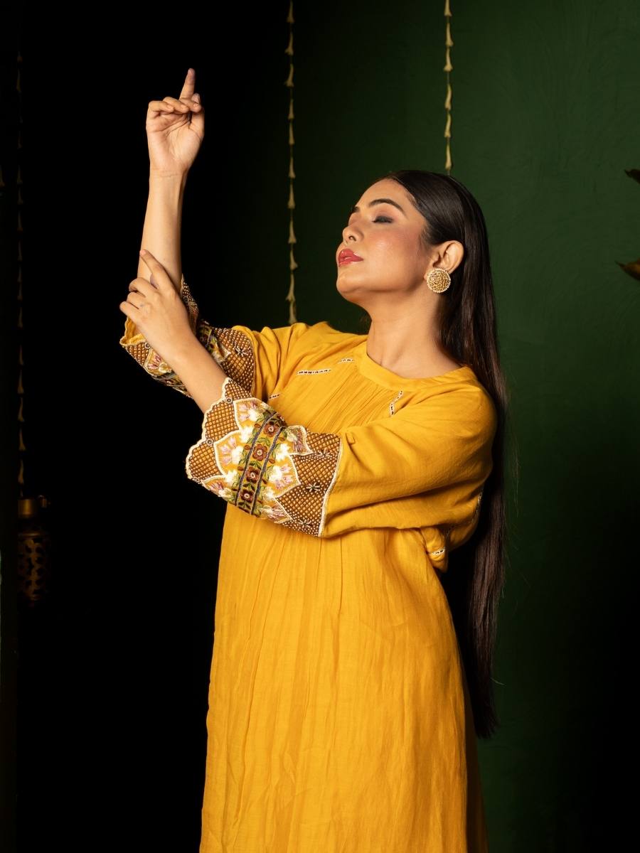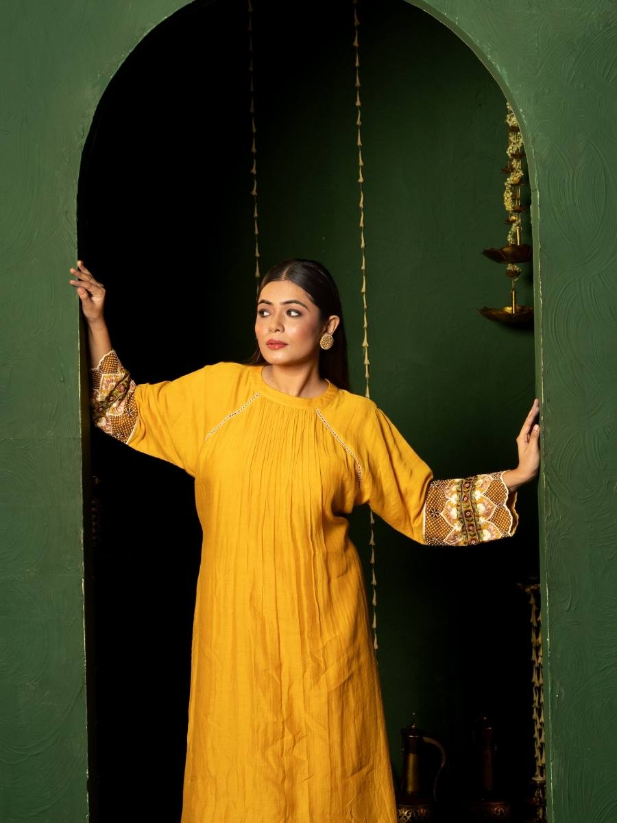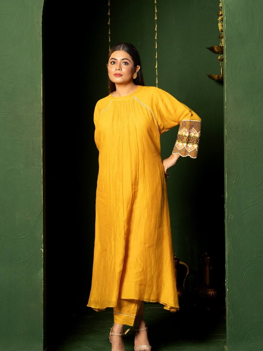 Step into a world of warmth and grace with the Basanti Gul Set, a celebration of spring’s eternal beauty.Crafted from soft mal chanderi, this kurta and pant set features hand and machine embroidery on the sleeve cuffs, with the gentle pleats on the pant cuffs adding an extra touch of refined elegance. A creation from Kainaat: Ek Kahaani by Punam Khetan, this set honors the radiant woman—her journey, her bloom, her story. Every detail whispers a tale of natural beauty and quiet strength.