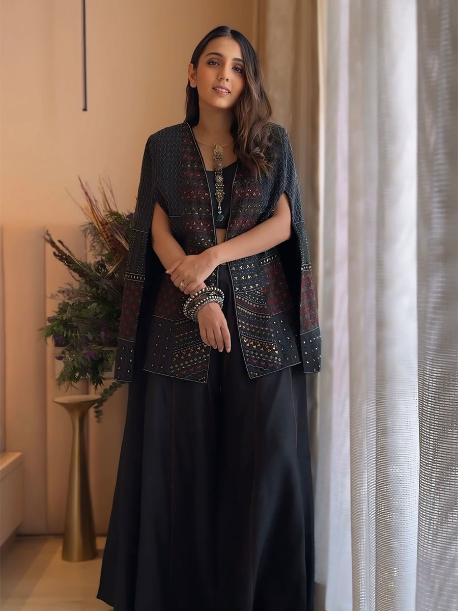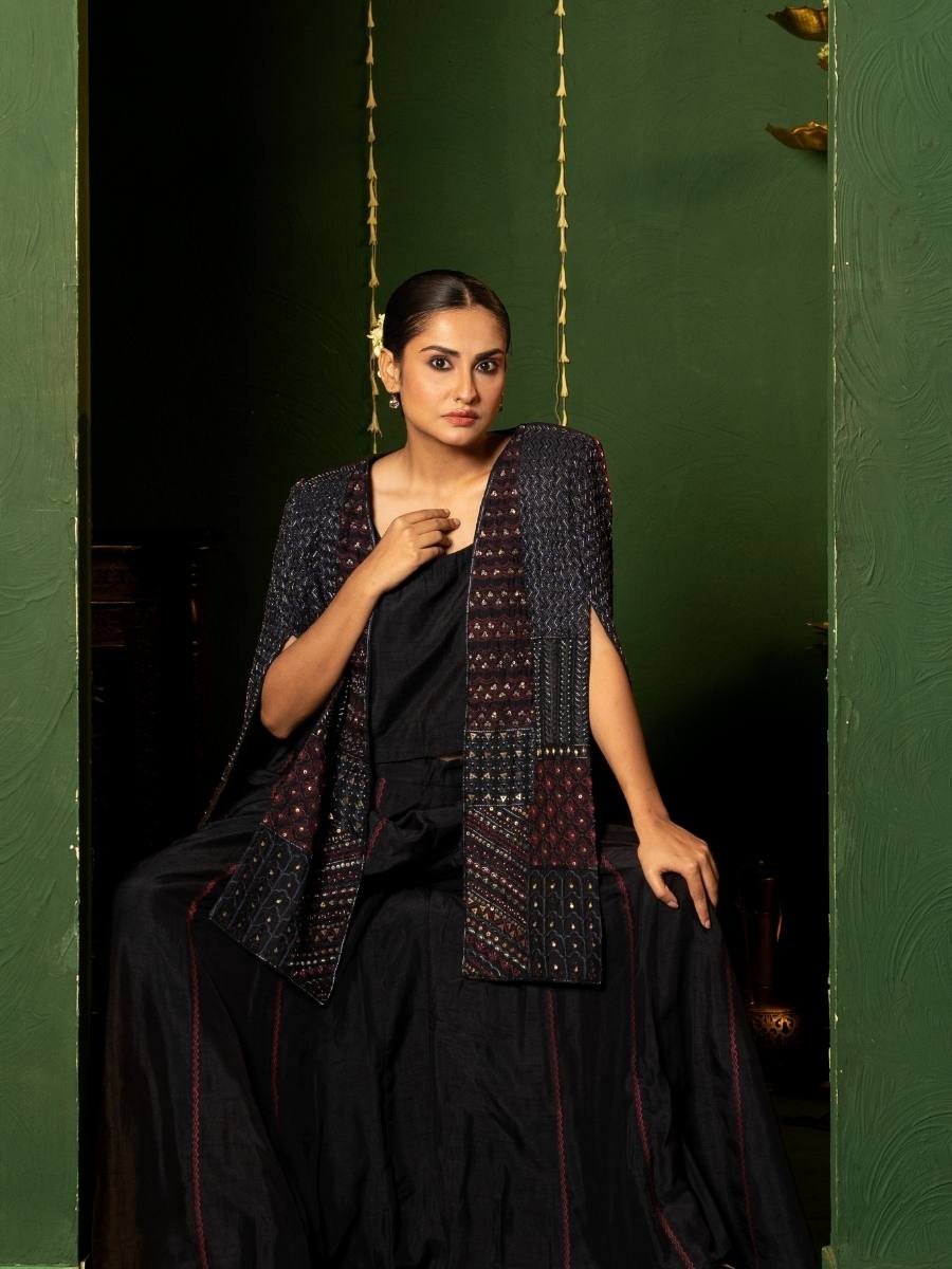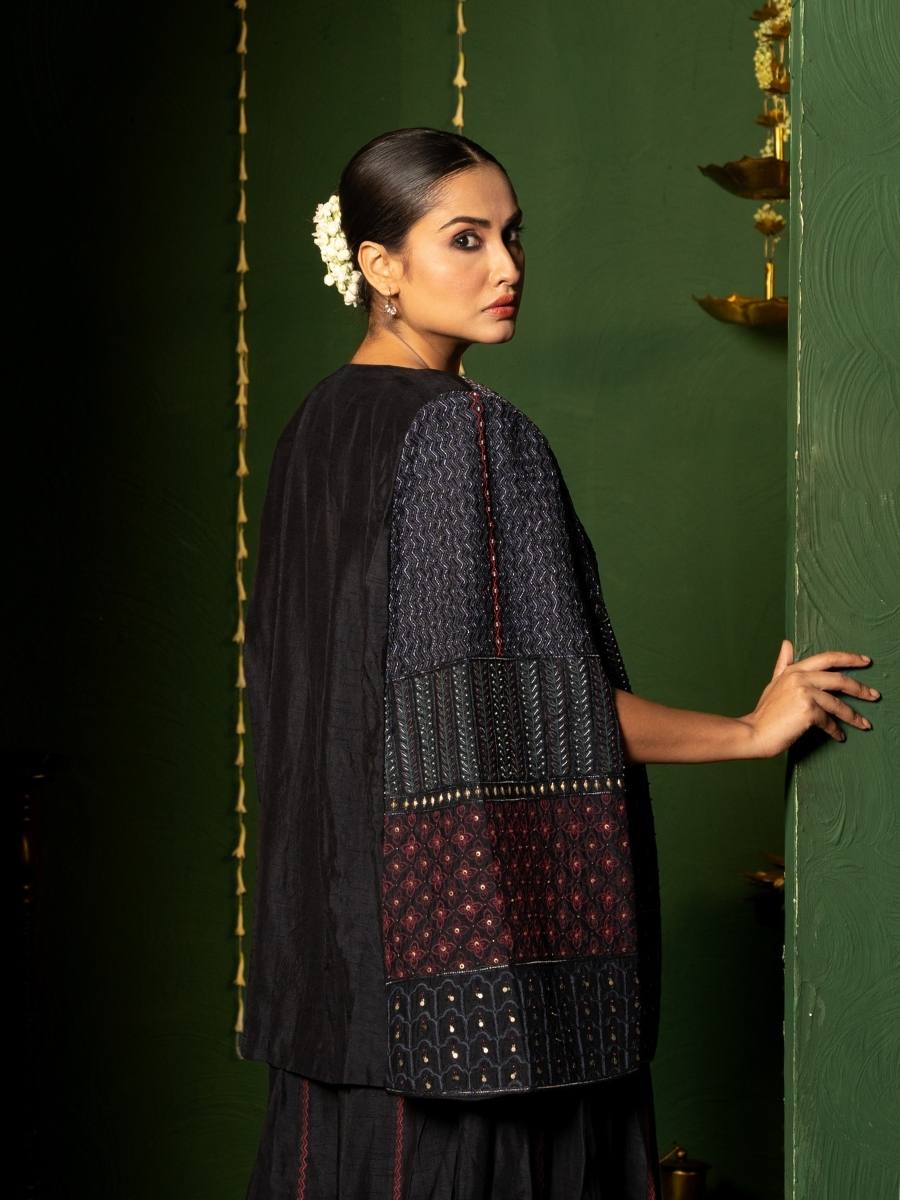 Flow into festive-glam with a kali-style palazzo and a breezy crop-top inner, adorned with playful hand and machine embroidery. The open-cut blazer adds a whimsical touch, creating a mirage of bohemian black hues.