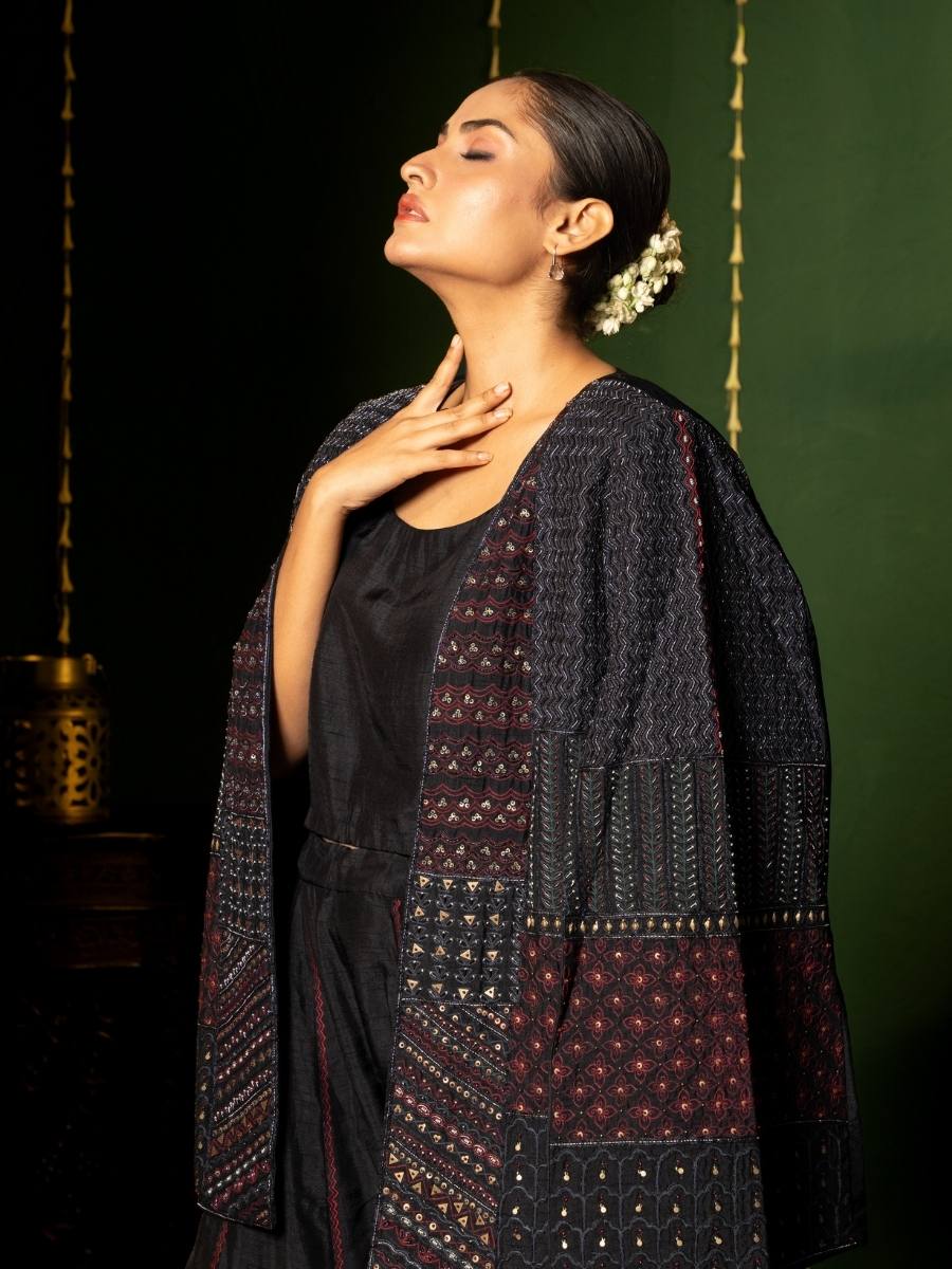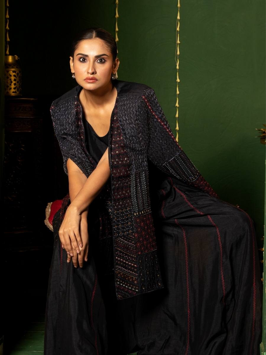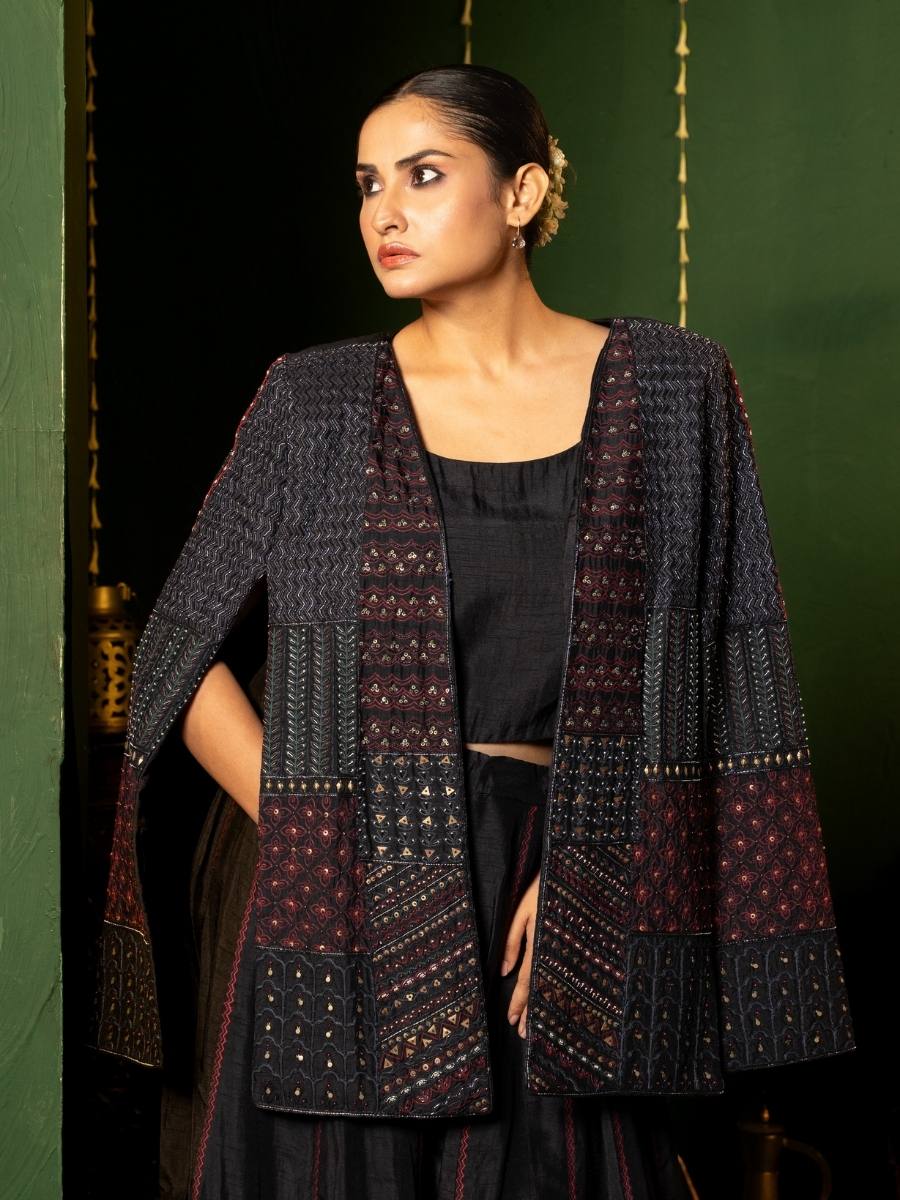 Flow into festive-glam with a kali-style palazzo and a breezy crop-top inner, adorned with playful hand and machine embroidery. The open-cut blazer adds a whimsical touch, creating a mirage of bohemian black hues.