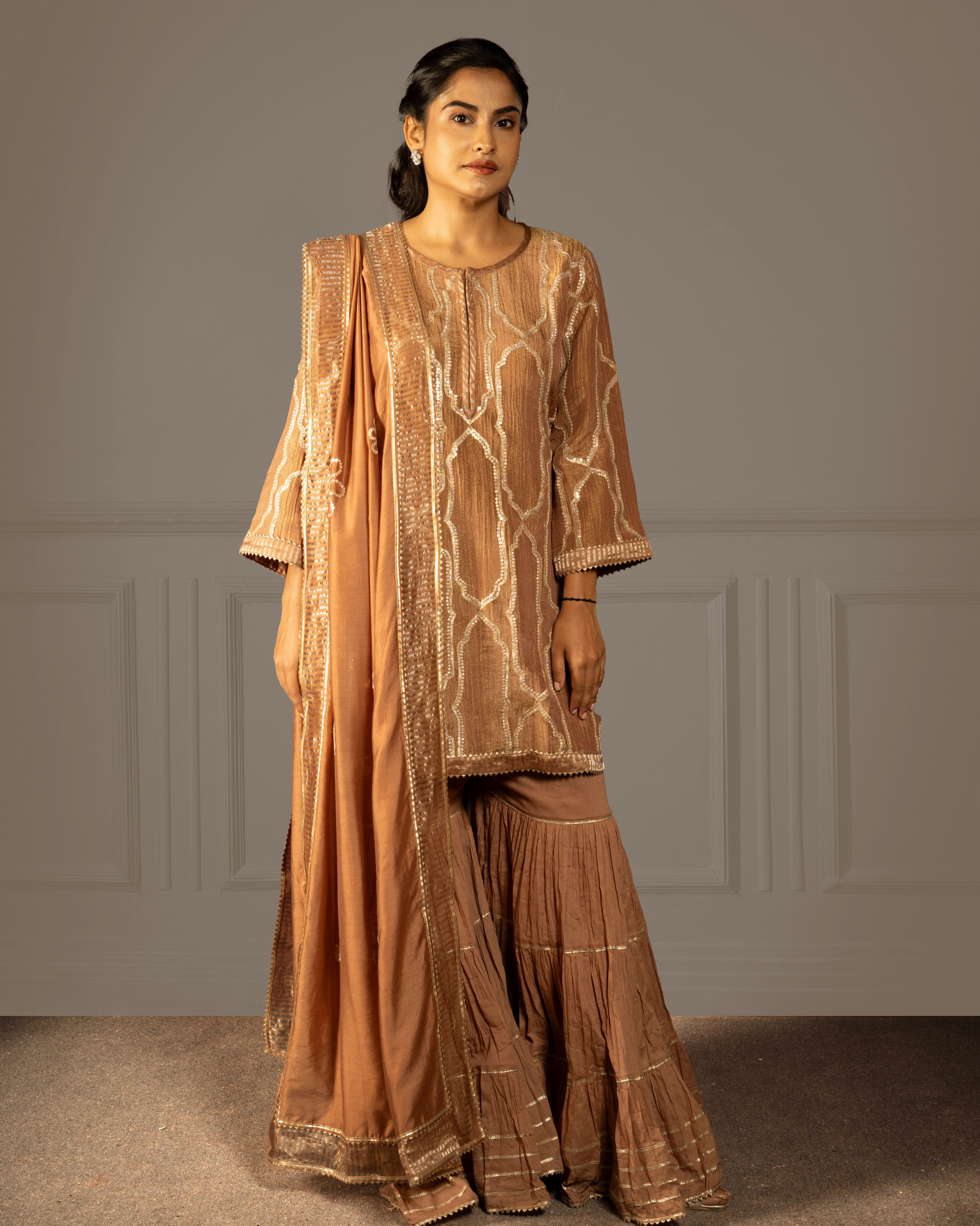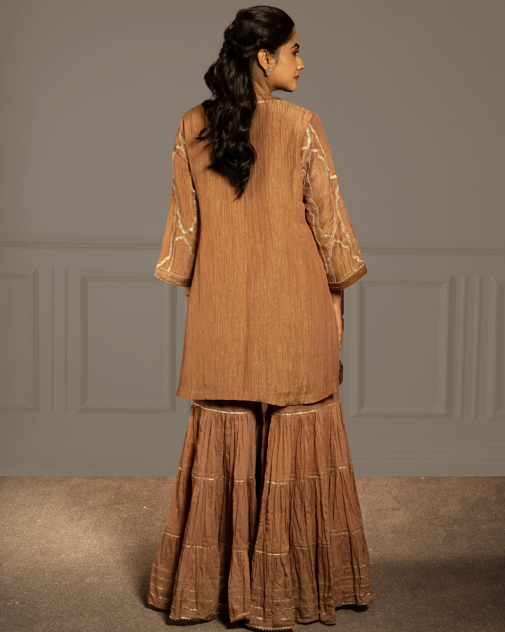A short tissue crush kurti with sharara and dupatta, adorned with gota, tikki, and intricate hand–machine embroidery — rooted in stillness and strength, embodying the grounded grace of the Earth element.