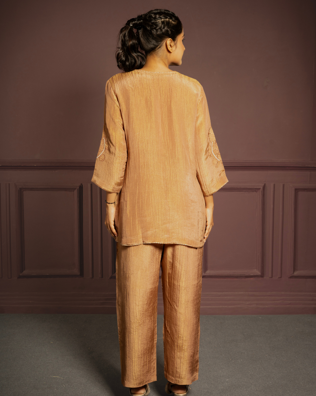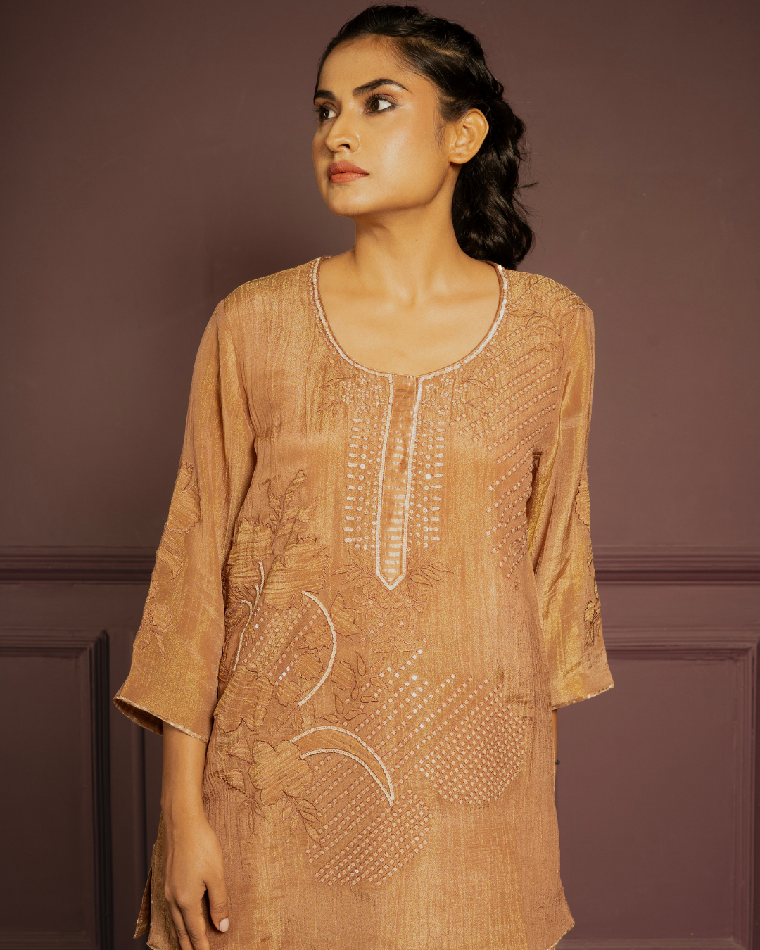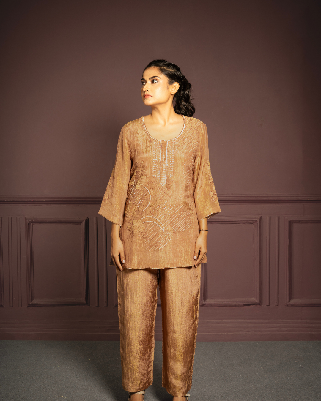 A brown appliqué–embroidered top with hand-machine embroidery, paired with straight tissue crush pants — rooted in the quiet strength of the Earth.